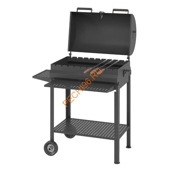 Гриль-мангал Везувий "От шефа" предназначен для приготовления блюд на открытом воздухе. Материал - особо прочная котловая сталь (09Г2С) 3 мм. Для удобства перемещения снабжен двумя колесиками. Конструкция предусматривает боковые и нижнюю полочки для хранения посуды или дров, угля.