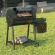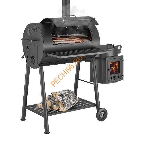 Для удобного использования на передней поверхности смокера сделана съёмная стальная полка для размещения продуктов и посуды. Смокер установлен на подставке с надёжными стальными ножками. В нижней части подставки сделана полка, на которой удобно хранить дрова и инструменты для работы со смокером. Две ножки смокера оснащены колёсами для удобства перемещения изделия по зоне барбекю. Для перекатывания смокера используется ручка на боковой стороне основного модуля смокера. Материал - особо прочная котловая сталь (09Г2С) 3 мм.