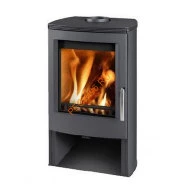 - Печь выполнена в классическом стиле с минимумом декоративных элементов. Большую часть передней панели занимает полукруглая дверца со стеклом, под дверцей расположена откидная горизонтальная дверца, за которой скрывается объемный зольный ящик из нержавеющей стали.