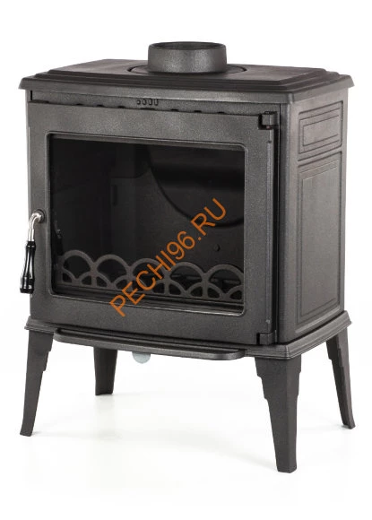 - Печь стоит на высоких устойчивых ножках, это удобно и безопасно. Объемная топка, футерованная вермикулитом, вмещает поленья стандартного размера, для защиты стекла предусмотрена высокая решетка.