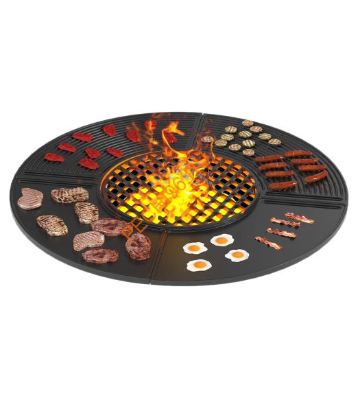 Чугунная плита Gurman 1000 состоит из двух секторов. Каждый сектор за счёт формы литья разделён на две части. Часть с гладким основанием позволяет жарить на очаге продукты, как на обычной сковородке. Часть с ребристым основанием, как у сковороды-гриль, предназначена для получения красивого узора на готовых продуктах. Небольшой бортик по краю плиты ограничивает рабочее пространство, предотвращает попадание жира в огонь и его возгорание. В середине плиты размещена чугунная решётка Везувий Стейк. Эта решётка предназначена для готовки мяса и овощей с красивым диагональным рисунком.