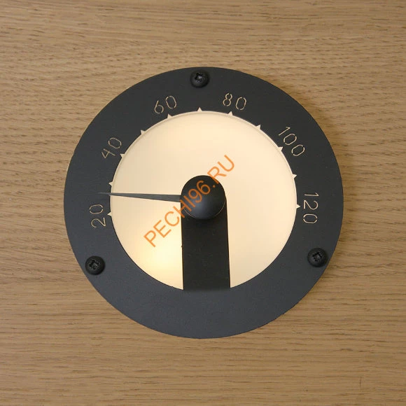 Круглый термометр с матовым стеклом, шкала из нержавеющей стали. Подсвечивается одним волокном S-Flex 2 - 4 M8. Устанавливается при обшивке сауны. Размер термометра 120 х 120 мм, глубина ниши для установки 40 мм. Выступает над поверхностью обшивки на 20 мм. Крепится к стене тремя винтами из нержавеющей стали, входящими в комплект.
