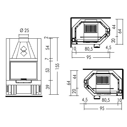 Закрытая топка со стальным корпусом и большим обзором огня. Боковое стекло (правое или левое) под углом 45°. Очаг с чугунной футеровкой. Плавный подъем дверцы - гильотина. Топка может устанавливаться как с фронтальной, так и с угловой облицовкой.