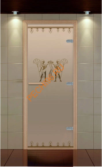 Модель стеклянной двери в египетском стиле с изображением фараона. Неброский рисунок прекрасно смотрится на стекле. Такое дизайнерское решение дополнит скромный интерьер. А дверь в парилку порадует посетителей надежностью и красотой. Стеклянные двери для бани и сауны торговой марки АЛЬДОВУД – сохраняют в помещении необходимый температурный режим, плотно закрываются, не допуская сквозняков и потери пара. Сочетание уникальных технологий обработки стекла и дерева, дает возможность производителю изготавливать стеклянные двери для саун и бань, которые отличаются дорогими комплектующими и высокими эксплуатационными характеристиками.