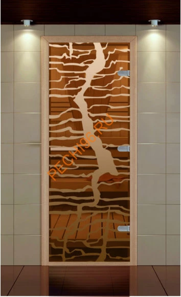 Дверь «Молния» - прекрасный вариант для Вашей сауны. Абстрактный рисунок на стекле смотрится очень органично. Такой вариант двери идеально подойдет под любой интерьер. Стеклянные двери для бани и сауны торговой марки АЛЬДОВУД – сохраняют в помещении необходимый температурный режим, плотно закрываются, не допуская сквозняков и потери пара. Сочетание уникальных технологий обработки стекла и дерева, дает возможность производителю изготавливать стеклянные двери для саун и бань, которые отличаются дорогими комплектующими и высокими эксплуатационными характеристиками.