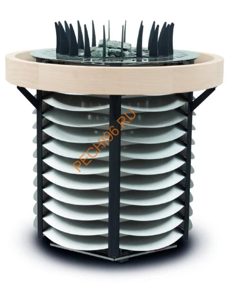 Электрическая печь для сауны Shark. Печь Shark - это вызов привычному укладу и стандартным конструкциям. Корпус печи круглый, выполнен в виде колец, а заканчивается конструкция открытой корзиной для камней, со своеобразной «короной» с острыми зубцами, по форме напоминающими плавники акулы. Эта электрическая каменка для сауны сочетает в себе мягкие линии, острые зубцы и корпус из полированной нержавеющей стали – который как зеркало отражает все грани.
