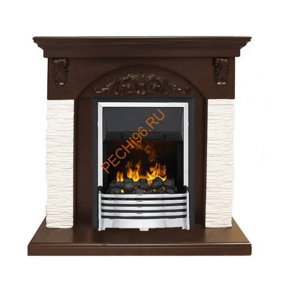 Портал Bern выполнен в классическом стиле. Он изготовлен из камня, МДФ и натурального шпона. Фронтальная часть портала украшена резным орнаментом, который придает нотки античности. Колонны выполнены из мелкого белого сланца, столешница и постамент – из дерева в цвете "темный дуб". Зона очага визуально выделена деревянным обрамлением.
