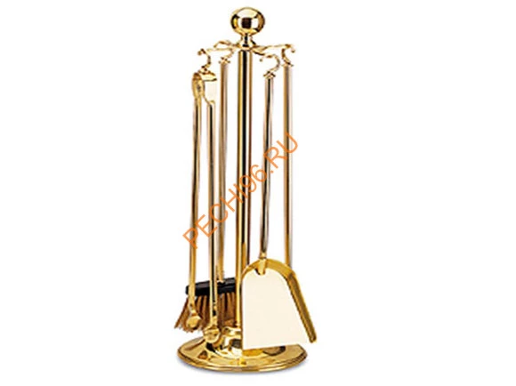 Оригинальный каминный набор Comex 10.189 в подставке из латуни, в которой размещены щетка, щипцы, совок и кочерга, помогающие в топке и уборке домашнего дровяного камина. Набор отличается повышенной термоустойчивостью, прочностью и надежностью. Стильный дизайн и золотой цвет комплекта гармонично впишется в любой стиль оформления каминного уголка.