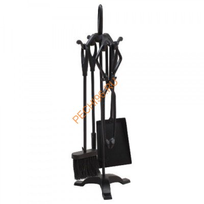 Каминный набор на подставке из стали, в которой размещены щетка, щипцы, совок и кочерга, помогающие в топке и уборке домашнего дровяного камина. Сталь в черном с хромом цвете придает комплекту элегантный старинный стиль. Набор отличается повышенной термоустойчивостью, прочностью и надежностью. Дизайн комплекта гармонично впишется в каминный уголок в винтажном стиле.