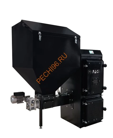 Горизонтальные теплообменники - визитная карточка котлов FACI. Конструкция котлов такова, что отходящие газы от сгоревшего топлива многократно проходят ВОКРУГ цилиндрических теплообменников. Это позволяет произвести максимальный теплосъем с отходящих газов и добиться КПД более 93%. Эксплуатация котла максимально сведена к простоте и удобству. Бункер котла вмещает в себя не менее 400 кг угля, а геометрия бункера спроектирована таким образом, чтобы уголь в нем не зависал. Двухслойная усиленная спираль шнека, в совокупности с мотор редуктором повышенной мощности, доставляет уголь фракцией до 50 мм в горелку и способна разламывать попадающие в бункер фракции большего диаметра.