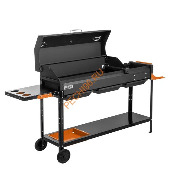 Мангал Helios SMART-1200 Премиум включает в себя жаровню с перфорированным дном, 3 съемных зольника, боковой столик с 3-мя подстаканниками, полку с лотком, держатель инструментов, крышку для приготовления блюд на гриле, а также колеса и боковую ручку для удобства перемещения мангала.
