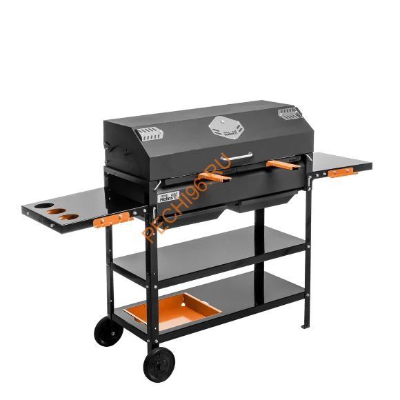 Мангал Helios SMART-800 Люкс - максимальная комплектация линейки SMART-800. Мангал оснащен всем необходимым для комфортного приготовления блюд на открытом огне: жаровней с перфорированным дном и зольниками, 2-мя полками (сплошной и с лотком), колесами, боковыми столиками с подстаканниками, крышкой гриль, держателем для инструментов, подъемным угольным лифтом для управления жаром, решеткой гриль.