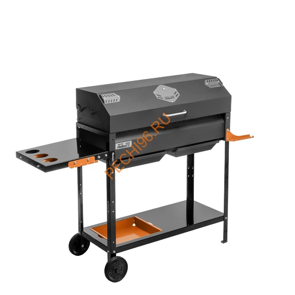 Мангал Helios SMART-800 Премиум - третья по увеличению опций модель серии SMART-800. В нее включены: боковой столик с подстаканниками, съемный лоток в полке, держатель для инструментов, крышка гриль и колеса для перемещения.