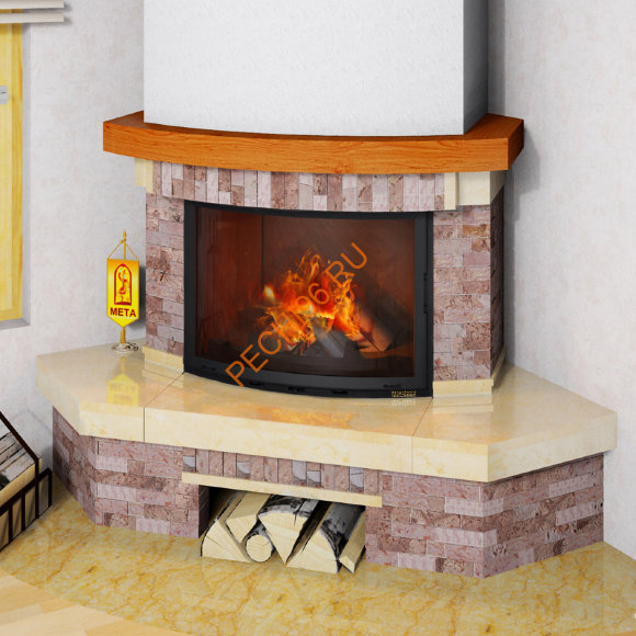 Угловая облицовка из натурального мрамора с обработкой «Антик» придаст особый стиль камину и создаст необыкновенную атмосферу в Вашем доме. Отличным дополнением является декоративная балка, изготовленная из массива ценных пород деревьев. Для дров имеется небольшая, но вместительная дровница.