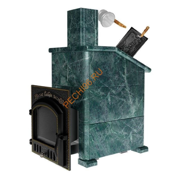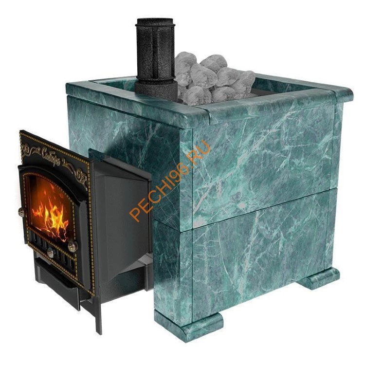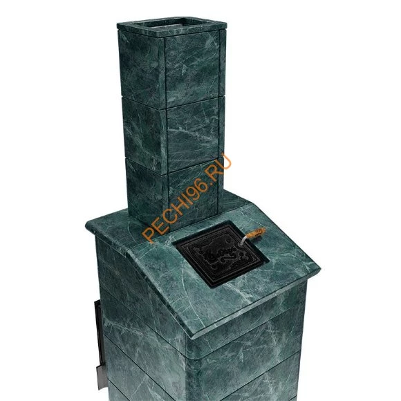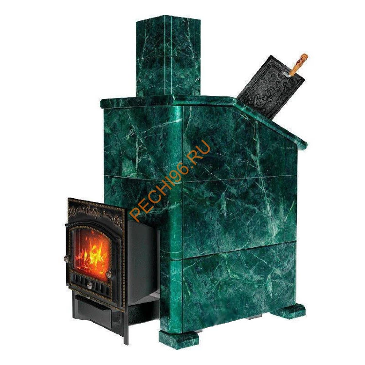 Змеевик - название камня напрямую связано с его необычной раскраской, очень похожей на раскраску змеиной кожи: характерные пятна и прожилки на зеленовато-жёлтом или тёмно-зелёном фоне. Влажный пар и высокие температуры в условиях русской парной подвергает большим испытаниям банную печь и ее облицовку в долгосрочной эксплуатации. Повышенная влажность с экстремальными перепадами температуры губительно отражается на кирпичной конструкции и приводит к разрушению уже в скором времени. Природный камень в качестве облицовки печей считается хорошей альтернативой за его прочность при длительной эксплуатации и эффективность. Змеевик выгодно отличается от кирпичной кладки с цементным раствором своими свойствами. Природный камень в облицовке обеспечивает гораздо большую скорость разогрева до нужной температуры без необходимости многочасовой подготовки печи. По своему химическому составу Змеевик - силикат магния с содержанием магнетита, карбоната, талька и других минералов. Змеевик оказывает положительное воздействие на организм человека: снимает боли в шее и голове; стабилизирует тонус; успокаивает; лечит при простуде; устраняет воспаление.