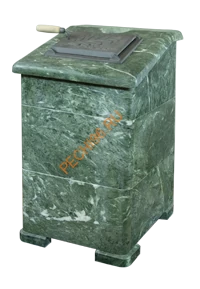 Змеевик - название камня напрямую связано с его необычной раскраской, очень похожей на раскраску змеиной кожи: характерные пятна и прожилки на зеленовато-жёлтом или тёмно-зелёном фоне. Влажный пар и высокие температуры в условиях русской парной подвергает большим испытаниям банную печь и ее облицовку в долгосрочной эксплуатации. Повышенная влажность с экстремальными перепадами температуры губительно отражается на кирпичной конструкции и приводит к разрушению уже в скором времени. Природный камень в качестве облицовки печей считается хорошей альтернативой за его прочность при длительной эксплуатации и эффективность. Талькомагнезит или змеевик выгодно отличается от кирпичной кладки с цементным раствором своими свойствами. Природный камень в облицовке обеспечивает гораздо большую скорость разогрева до нужной температуры без необходимости многочасовой подготовки печи. Уже через час с лишним печь в облицовке из природного камня выдает легкий пар и достаточную температуру в парной.