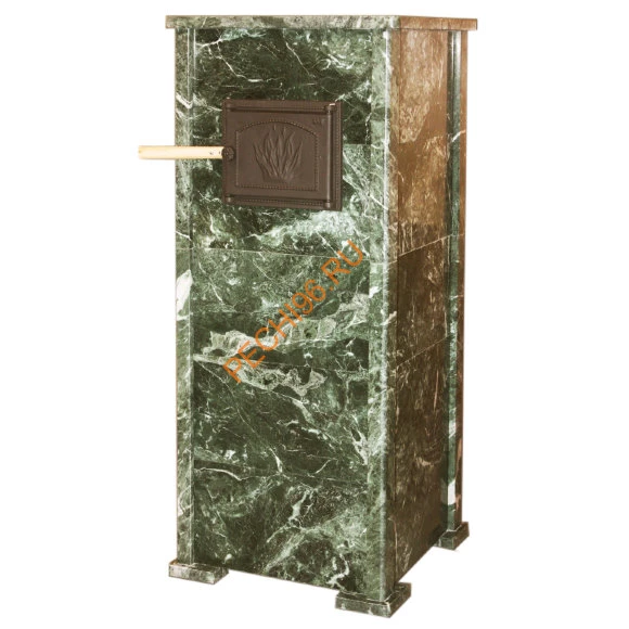 Змеевик - название камня напрямую связано с его необычной раскраской, очень похожей на раскраску змеиной кожи: характерные пятна и прожилки на зеленовато-жёлтом или тёмно-зелёном фоне. Влажный пар и высокие температуры в условиях русской парной подвергает большим испытаниям банную печь и ее облицовку в долгосрочной эксплуатации. Повышенная влажность с экстремальными перепадами температуры губительно отражается на кирпичной конструкции и приводит к разрушению уже в скором времени. Природный камень в качестве облицовки печей считается хорошей альтернативой за его прочность при длительной эксплуатации и эффективность. Змеевик выгодно отличается от кирпичной кладки с цементным раствором своими свойствами. Природный камень в облицовке обеспечивает гораздо большую скорость разогрева до нужной температуры без необходимости многочасовой подготовки печи. Уже через час с лишним печь в облицовке из природного камня выдает легкий пар и достаточную температуру в парной.