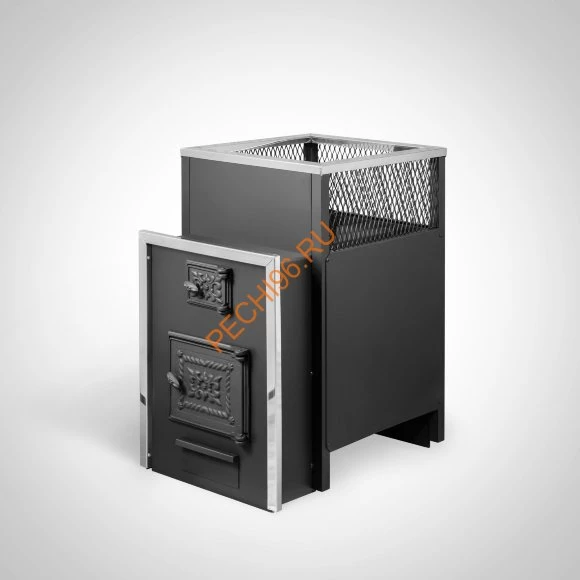 Печь предназначена для парных средних размеров. Вместительная вентилируемая каменка открытого типа является мощным парогенератором. Конвекционный кожух печи способствует циркуляции воздуха, экранирует жесткое инфракрасное излучение от раскаленных стенок топки. Кожух съемный.