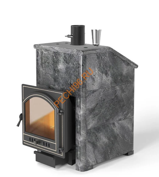 Данную модель печи отличает от аналогов то, что закрытая каменка расположена внутри топки. Это позволяет максимально быстро и хорошо прогревать камни, которые расположены внутри каменки. На камни через специальную трубку с отверстиями поддается вода, которая моментально испаряется, превращаясь в мелкодисперсный пар. В комплект также входит облицовка из талькохлорита толщиной 40 мм. Облицовка из натурального камня смотрится оригинально и способна существенно преобразить интерьер Вашей бани. Но помимо декоративной функции, талькохлорит аккумулирует тепло, способствует более равномерному его распределению в парной, и благодаря данному натуральному камню температура в парной долго не падает. Облицовка из натурального камня также отличается долговечностью, она прослужит Вам долгие годы. Еще один плюс данной облицовки – простота ухода. Достаточно просто протереть её губкой. Талькохлорит – экологически чистый материал, он не выделяет вредных веществ при нагревании, полностью безопасен для здоровья.