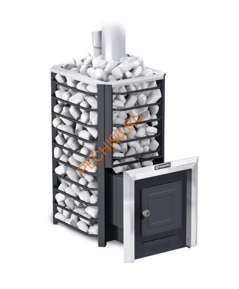Все элементы декора, задняя стенка, обрамление печи, дверцы и зольника выполнены из жаростойкой хромированной нержавеющей стали INOX AISI-430. Все наружные стальные элементы корпуса печи, топочный канал, каменка и кожух окрашены качественной жаропрочной износостойкой кремнийорганической краской черного матового цвета. Краска приобретает окончательную прочность и стойкость к механическим повреждениям (полимеризуется) только после первого протапливания и остывания печи. Первую протопку для полимеризации краски рекомендуется проводить на свежем воздухе. Кожух печи может частично или полностью разбираться для установки необходимых опций. Навесные опции или теплообменник можно устанавливать с 2-х боковых сторон печи. В боковых стенках кожуха также предусмотрены 2 отверстия для установки теплообменника.