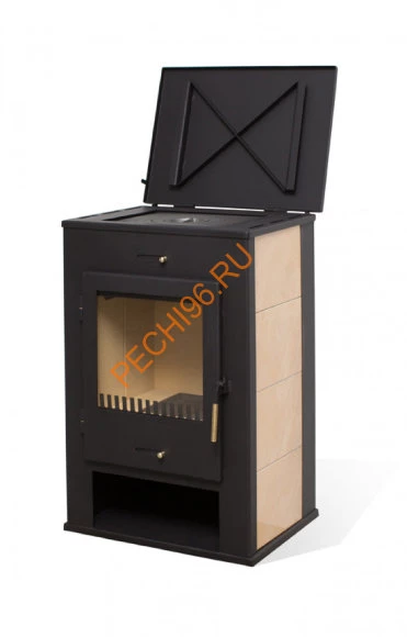 - Верхняя панель корпуса представляет собой варочную поверхность. Она изготовлена из стали толщиной 8 мм и снабжена съемными конфорками. Если вы не планируете готовить или разогревать на печи пищу, панель легко закрыть крышкой, которая идет в комплекте с печью.