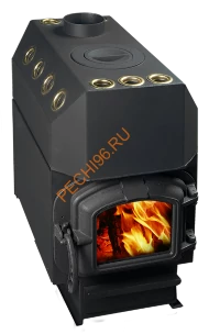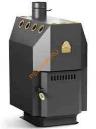 Отопительная печь длительного горения Прометей предназначена для отопления частных домов, дач, гаражей, теплиц, для приготовления и разогрева пищи. Печь относится к нагревательным устройствам конвекционного типа, работающим на твердом топливе (дрова). В печи предусмотрены два канала подачи вторичного воздуха: один на передней и один на задней стенке топки. Конструкция топки имеет трехходовую схему прохождения горючих газов, что позволяет получать максимальное значение КПД тепловой энергии сжигаемого топлива. Длинная колосниковая решетка из массивного литейного чугуна, обеспечивает равномерное и мощное горение дров. Удобный выдвижной зольный ящик, позволяет регулировать интенсивность горения. Верхняя горизонтальная плита оборудована съемной чугунной конфоркой для приготовления пищи. Все элементы печи, имеющие непосредственный контакт с горением топлива (кроме верхней плиты) изолированы конвекторами, экранирующими жесткое инфракрасное излучение и создающими мягкое конвенционное тепло в помещении. Вертикальная дверка топливника позволяет заполнить печь максимальным количеством дров для длительного и непрерывного горения. На дверце установлен светопрозрачный экран из жаропрочного стекла, который позволяет контролировать процесс горения. Выход парубка дымохода под 45 градусов, в комплекте с печью идет шибер-адаптер, он имеет форму колена. Одевая шибер-адаптер и вращая его вокруг оси, можно изменять выход дымохода, как вертикально, так и горизонтально для прохождения через стену.
