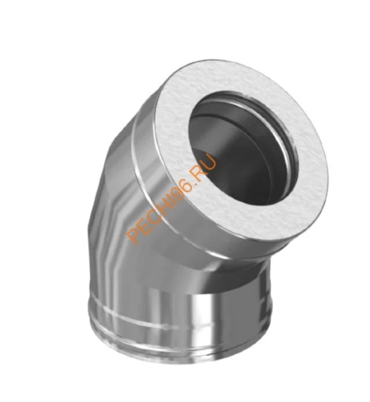 Отвод 45 градусов из нержавеющей стали марки AISI 321/430 толщиной 0,5 мм выполнен из 2-х секций. Все детали дымоходов имеют раструбную систему сборки. Рабочая температура дымохода данной марки нержавеющей стали не выше 600 °С. Теплоизоляция - из керамического волокна, это позволяет свести к минимуму образование конденсата и будет способствовать быстрому прогреву дымоходного канала и выходу системы в рабочий режим. Рекомендуемый вид топлива - газ, дрова.