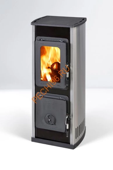 Отопительно-варочная каминная печь Milano ll - это простая, компактная и надежная печь. Цвет печи - черный/нержавеющая сталь. Корпус печи выполнен из стали. Стальные печи быстро прогревают воздух в помещении, они начинают давать тепло уже через 15 минут после растопки. Фактически данная печь является высококачественной буржуйкой. Мощность модели составляет 5 кВт и при КПД в 72% печь легко сможет обогреть помещение до 124 кубических метров. Варочная поверхность и дверцы выполнены из чугуна. Внутренняя поверхность печи выполнена из огнеупорной керамики - шамота. Благодаря двойным стенкам печи-камина, через несколько лет эксплуатации Вы сможете заменить их, не меняя саму печь.