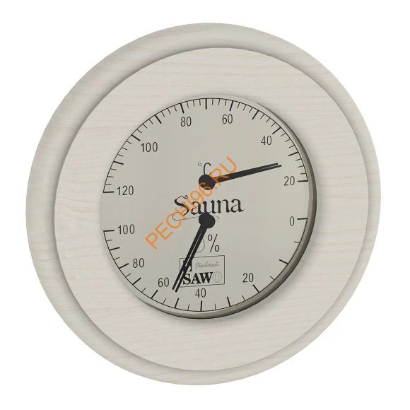 Термогигрометр 231-THA от компании Sawo имеет оригинальную круглую форму. В широкой рамке из древесины осины находится большой, круглый, графичный циферблат. Циферблат разделён на две шкалы. Одна из них - это гигрометр, который с точностью измерит уровень влажности, другая - термометр, который сообщит о температуре воздуха. Данный прибор прекрасно подойдёт для использования в парной. Благодаря универсальному дизайну он станет прекрасным дополнением любого интерьера.
