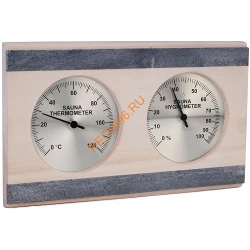 Термогигрометр 282-THRA от компании Sawo имеет классическую прямоугольную форму. В широкой рамке из древесины осины находится два круглых окошка. Под стеклом каждого окошка расположен графичный циферблат. Один из них - это гигрометр, который с точностью измерит уровень влажности в парной, другой - термометр, который сообщит о температуре воздуха. В данной модели кедровый корпус дополнен вставками из камня талькохлорита, что делает её ещё более эстетичной. Данный прибор прекрасно подойдёт для использования в любом парильном помещении.