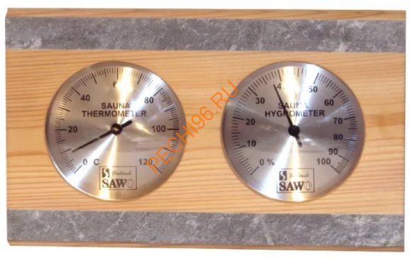Термогигрометр 282-THRD от компании Sawo имеет классическую прямоугольную форму. В широкой рамке из древесины кедра находится два круглых окошка. Под стеклом каждого окошка расположен графичный циферблат. Один из них - это гигрометр, который с точностью измерит уровень влажности в парной, другой - термометр, который сообщит о температуре воздуха. В данной модели кедровый корпус дополнен вставками из камня талькохлорита, что делает её ещё более эстетичной. Данный прибор прекрасно подойдёт для использования в любом парильном помещении.
