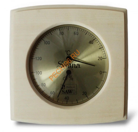 Термогигрометр 285-THA от компании Sawo имеет оригинальную квадратную форму. В широкой рамке из древесины осины находится большой, круглый, графичный циферблат. Циферблат разделён на две шкалы. Одна из них - это гигрометр, который с точностью измерит уровень влажности в парной, другая - термометр, который сообщит о температуре воздуха. Данный прибор прекрасно подойдёт для использования в любом парильном помещении.